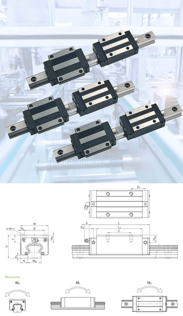Debido al diseño de cuatro filas, la guía lineal de la serie HG tiene las mismas capacidades de carga en el radial, radial inverso