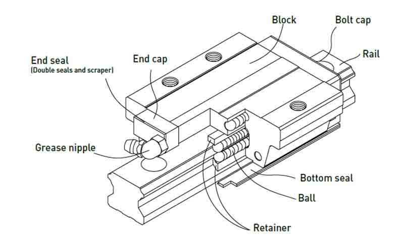 Because of precision dimensional control, the dimensional tolerance of HG series can be kept in a reasonable range, which means that any blocks and any rails in a specific series can be used together while maintaining dimensional tolerance. And a retainer is added to prevent the balls from falling out when the blocks are removed from the rail.