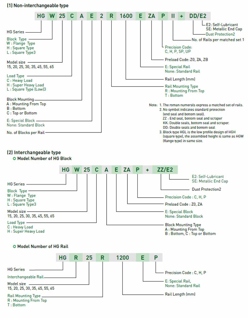 HG series guideways can be classified into non-interchangeable and interchangeable types. The sizes are identical. The only difference between the two types is that the interchangeable type of blocks and rails can be freely exchanged, and their accuracy can reach up to P class. The model number of HG series contains the size, type, accuracy class, preload class, etc..