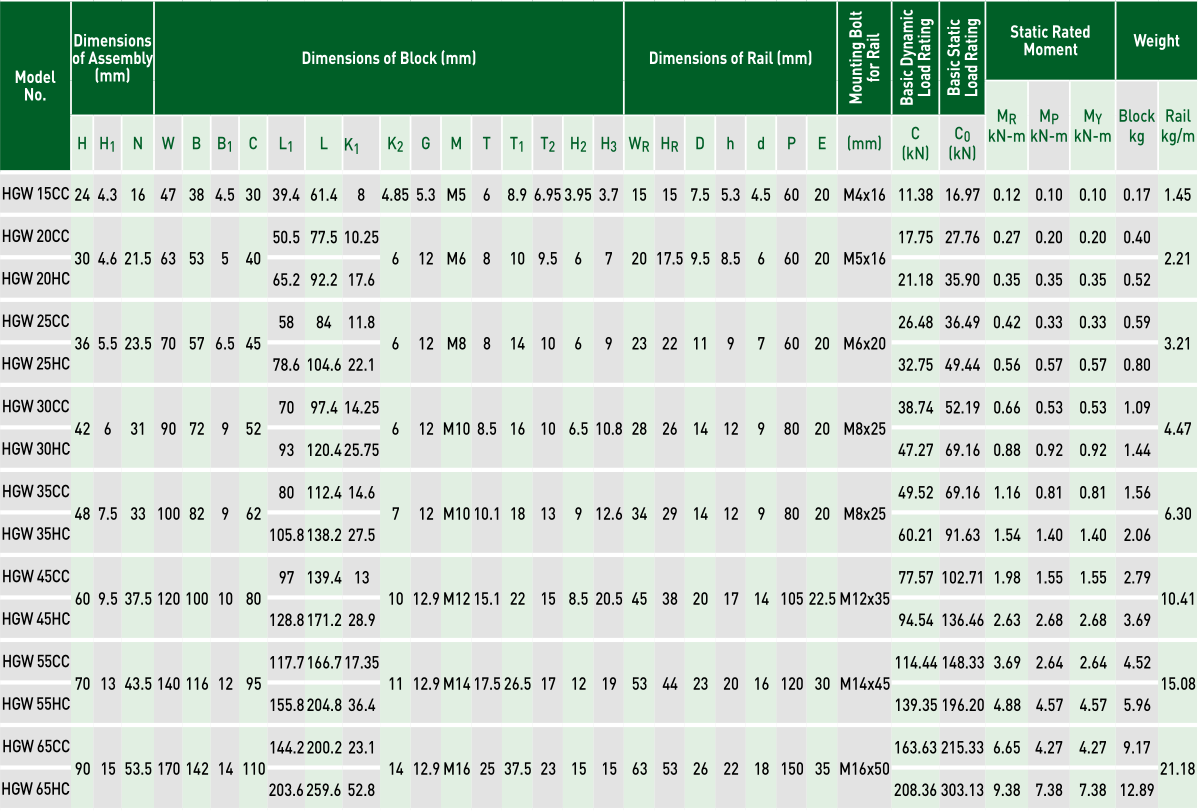 HG series linear guideways are designed with load capacity and rigidity higher than other similar products with circular-arc groove and structure optimization. It features equal load ratings in the radial, reverse radial and lateral directions, and self-aligning to absorb installation-error. Thus, HG series linear guideways can achieve a long life with high speed, high accuracy and smooth linear motion.