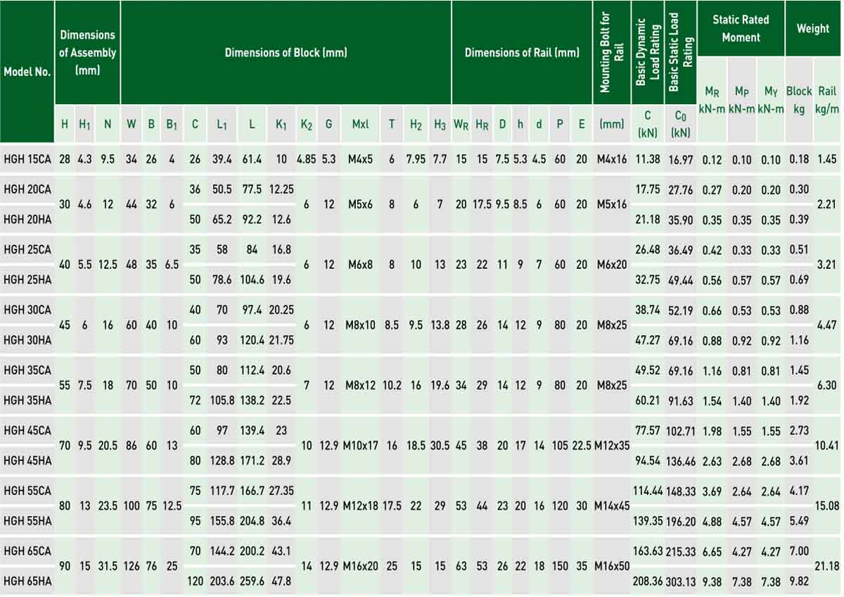 HG series linear guideways are designed with load capacity and rigidity higher than other similar products with circular-arc groove and structure optimization. It features equal load ratings in the radial, reverse radial and lateral directions, and self-aligning to absorb installation-error. Thus, HG series linear guideways can achieve a long life with high speed, high accuracy and smooth linear motion.