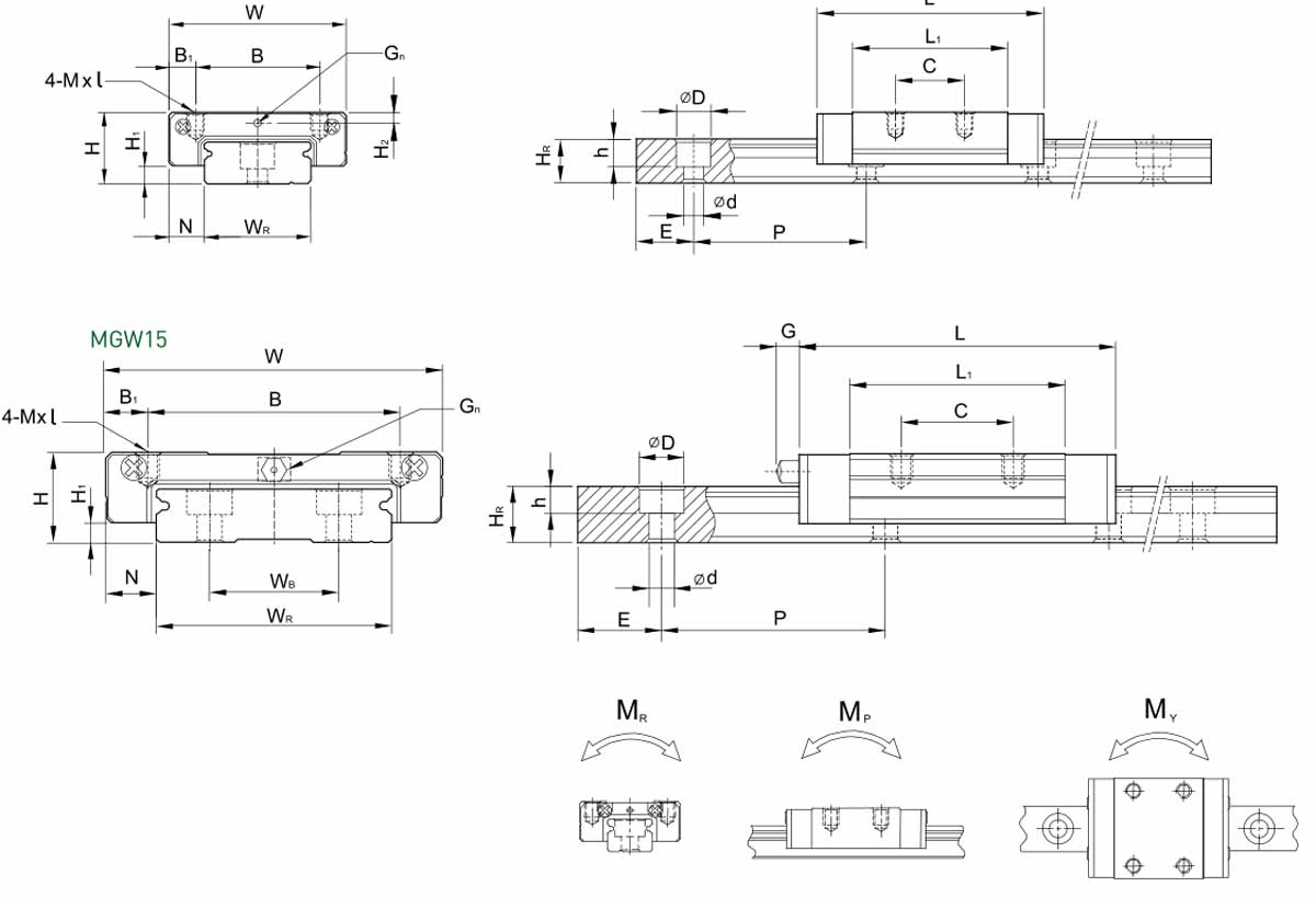 MGN and MGW series linear guideway can be classified into non interchangeable and interchangeable types, which are the same size.The interchangeable type is more convenient due to replaceable rails; however, the precision is less than non-interchangeable type. With strict dimension and quality control, the interchangeable type linear guideways would be a rather suitable choice for customers when rails don’t need to be paired. The model number contains information of the size, type, accuracy, preload, and so on.
